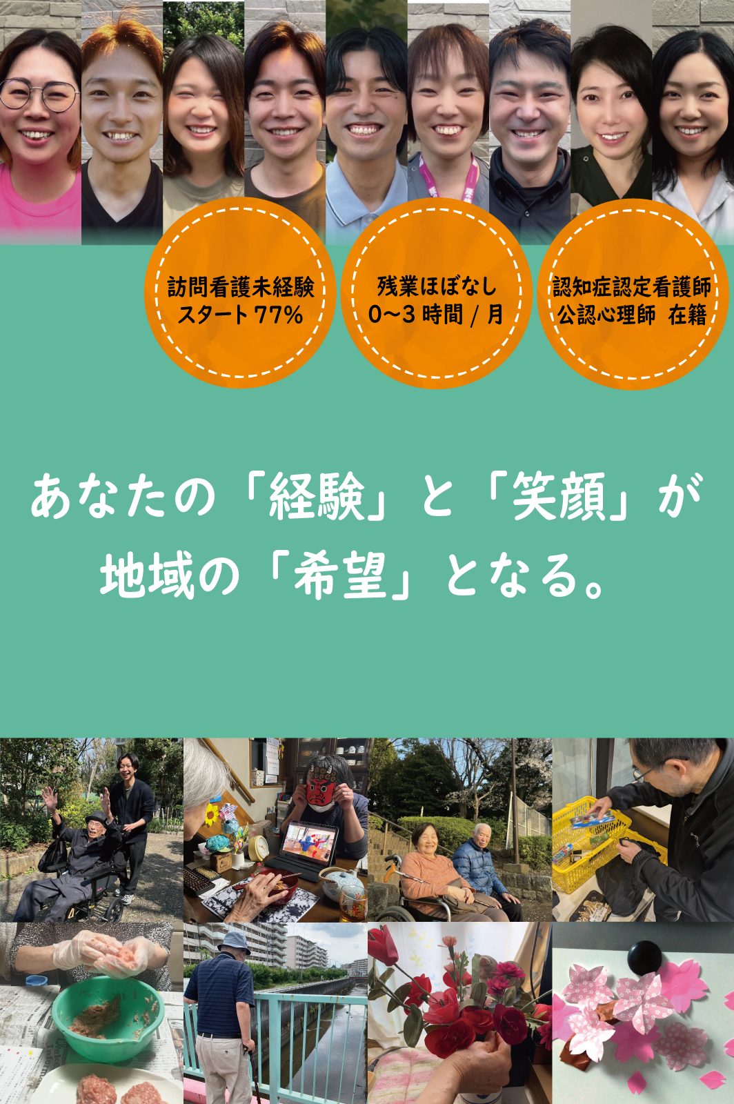 ご安心ください。実際に当ステーションに入職したスタッフの77%(13名中10名)が訪問看護未経験からのスタートです。未経験者を育ててきた実績とノウハウが豊富にありますので、先輩スタッフとの同行訪問を通じて、自信を持って回れるようになるまで丁寧に伴走します。